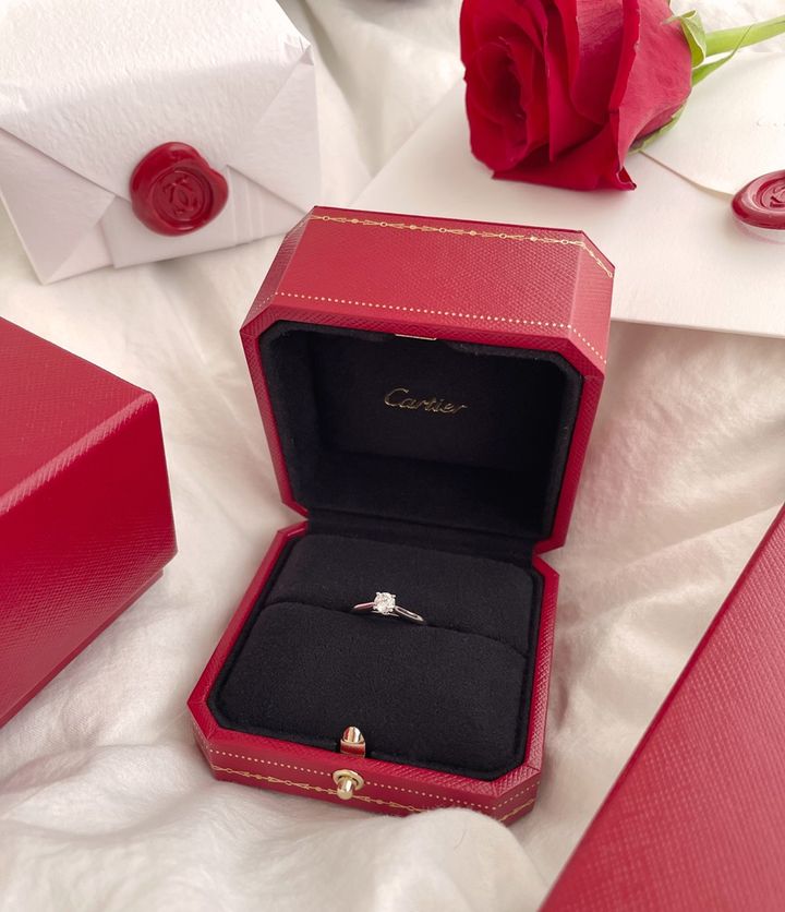 うにさん: はい、そうです。プロポーズは彼がサプライズで準備してくれたんですけど、婚約指輪の希望はなんとなく伝えてはいたので、希望通りのリングを贈っていただきました。Cartier(カルティエ)の1895です。もともとCartier(カルティエ)というブランドが大好きで、婚約指輪は割とシンプルで王道のものがいいなと思っていたんです。