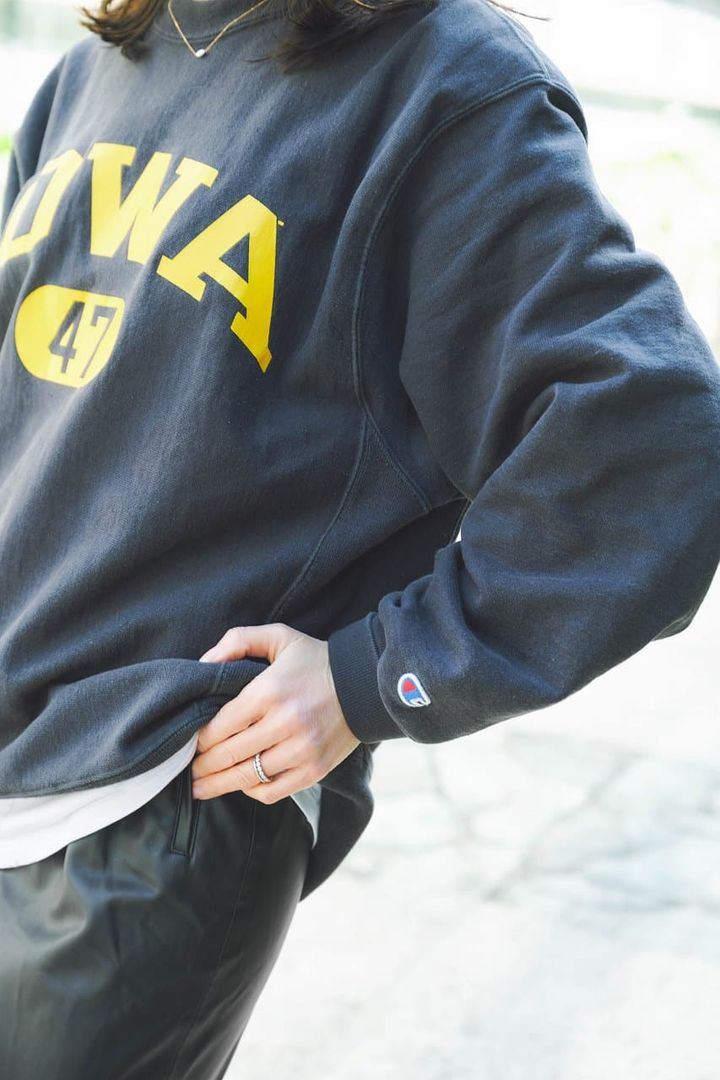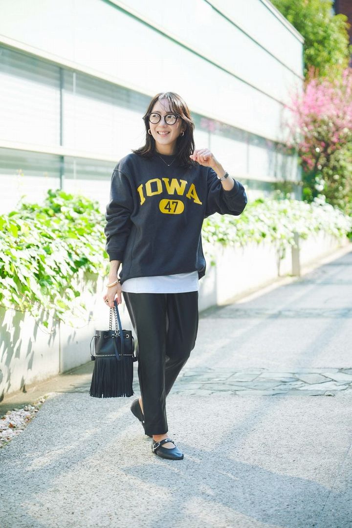 チャンピオンのメンズスウェットは、ほどよいオーバーサイズでこなれ感が出るところがおすすめ。カジュアル感を抑えるため、レザー合わせとメガネでコーデを引き締めます。シューズとバッグにレザー素材を取り入れることで、ラフすぎず大人っぽいスタイルに。着こなしが難しいイメージのある古着スウェットですが、スポーツMIXスタイルが流行している今こそ、色々なスタイルに挑戦してみたい。