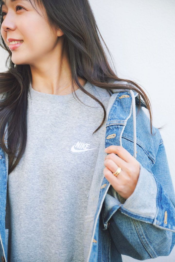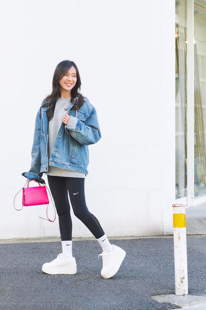 レギンスコーデは脚のラインが出るので、ZARAの厚底スニーカーで脚長効果を狙って。 デニムジャケットはオーバーサイズで、お尻まで隠れるところが安心です。ジム帰りでも友人とカフェに寄れるよう、差し色のピンクのミニバッグできれいめカジュアルに仕上げます。