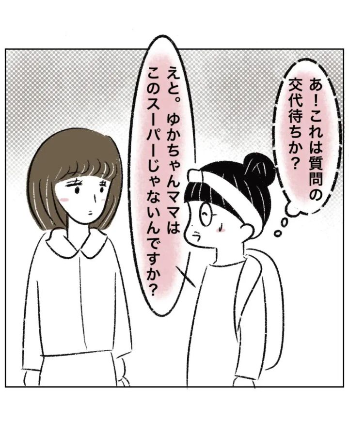 すると、なぜか沈黙になるゆかちゃんママ。「あ!これは質問の交代待ちか?」と思ったまるさんは、「えと。ゆかちゃんママはこのスーパーじゃないんですか?」と質問を振りました。