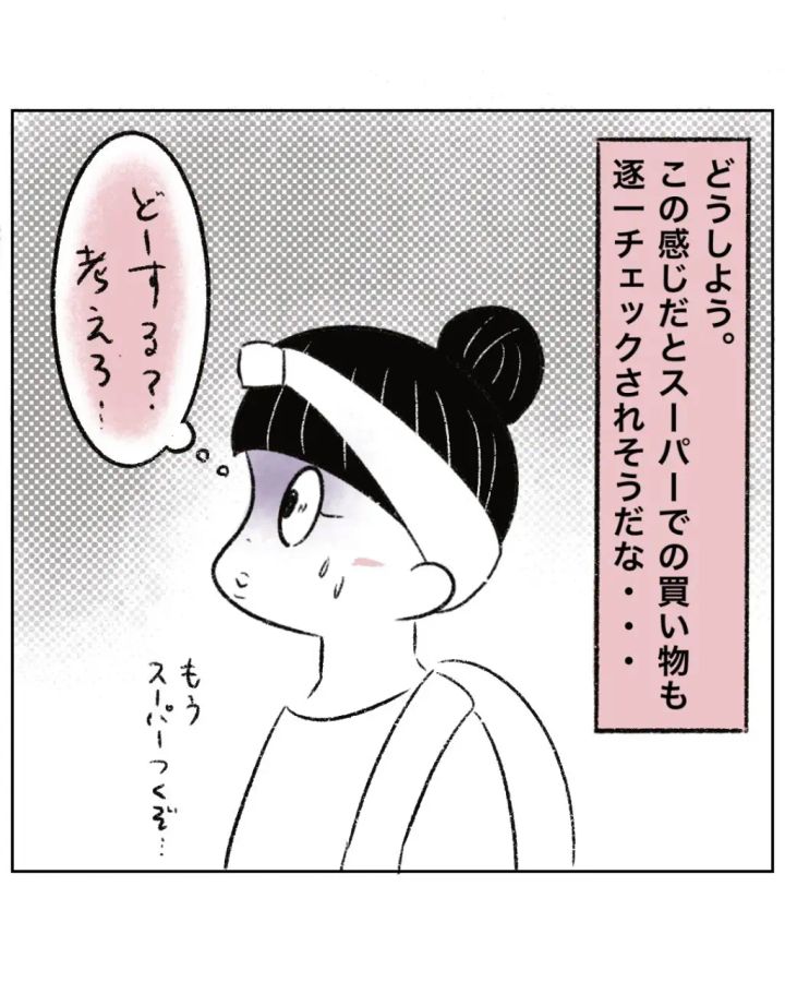 「よろしくお願いします」と答えたものの、スーパーが近づいてくると「どうしよう。この感じだとスーパーでの買い物も逐一チェックされそうだな・・」と、先ほどアキくんの服を細かくチェックしていたゆかちゃんママを思い出して気が重くなるまるさん。「どうしよう」と考えていると、