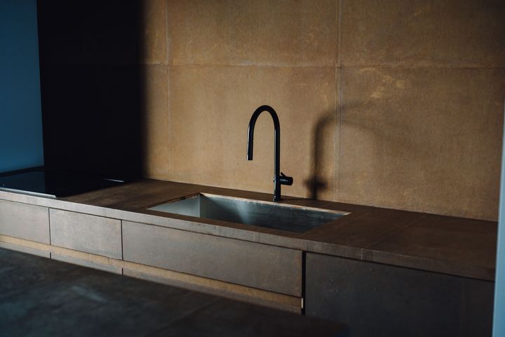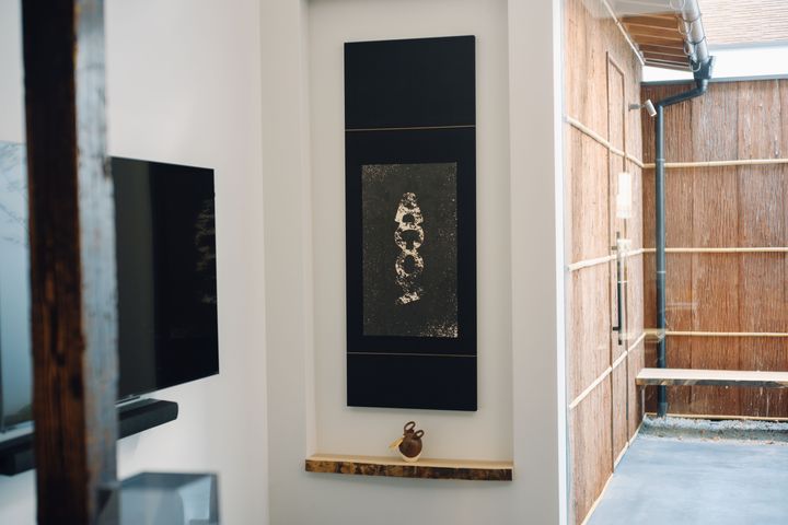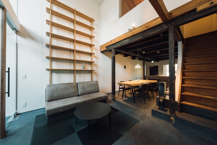 ヴィラの扉はパスコードで開閉するため、スムーズにチェックイン。靴を脱いで足を踏み入れれば、広々としたキッチンとダイニング、そして吹き抜けのリビングエリアまでが心地よくひと続きになっていることに気づくはずだ。炭を使った左官仕上げの黒いモルタルの床は、リビングエリアとガラス窓で隔てられた裏庭まで統一してあり、開放的な印象の一助に。その一方で、歴史ある木造建築らしさを残した天井や柱、階段部分などのオリジナルの遺構が、どこか懐かしさをも感じさせる。