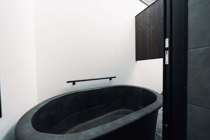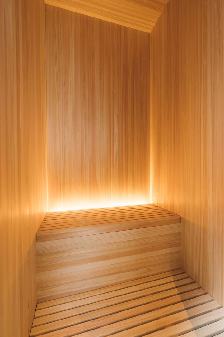 気になるバスルームは、シャワーブースと半露天風呂、そしてサウナという充実したラインナップ。離れにお風呂がついているという京都の町家らしい造りをアレンジして、家庭用サウナを設置したそう。ストーブに水をかけて蒸気を生じさせるロウリュ用の霧吹きで、お好みの温度と湿度に調整を。例えば浴槽に水を張っておき、サウナでしっかりと体を温めたあとに水風呂へダイブして、古都の風情を感じる裏庭で外気浴……という過ごし方も可能だ。シャンプーとコンディショナー、ボディソープには京都発のオーガニックコスメである「ネモハモ」のアイテムを採用。和ハーブを中心とした植物をふんだんに生かした香りに、ほっと癒されるはず。