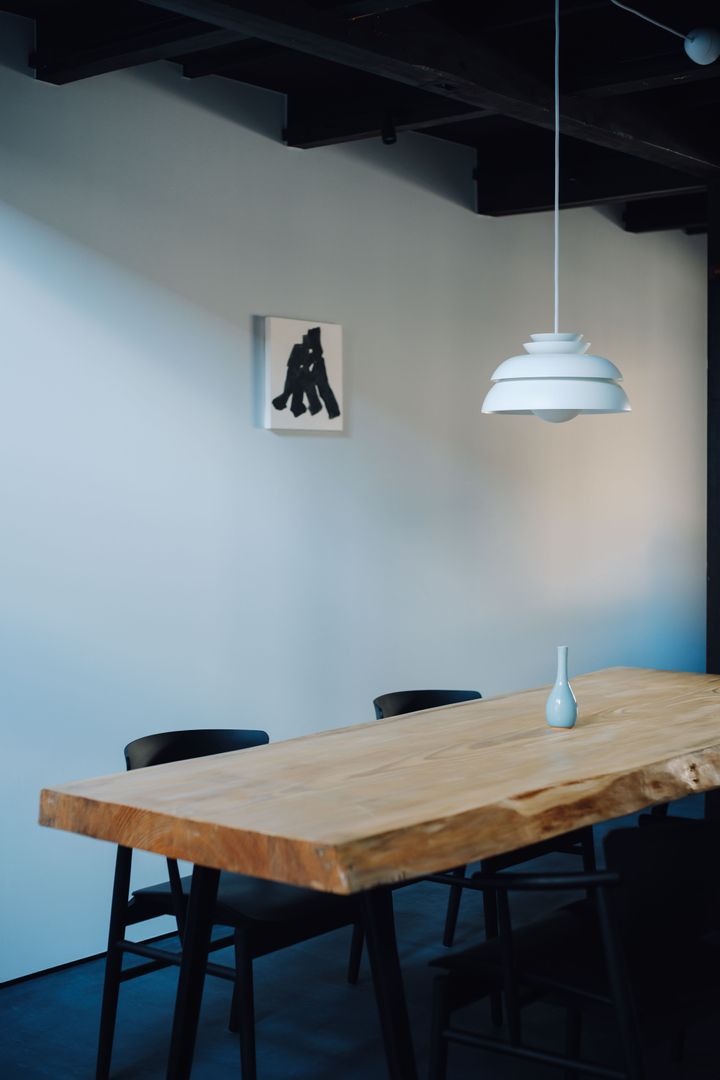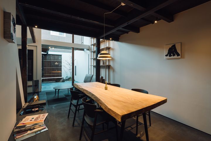 もちろん使い勝手のよさも申し分ない。建物が従来持つ要素とリンクさせながら、ナチュラルな一枚板のダイニングテーブルやブラックの琉球畳など、空間をモダンに昇華する技が随所に光っている。そこへデザイン性の高い調度品が今っぽい彩りを添え、居心地のよいムードを演出しているのだ。ラックには“滞在中自由に楽しめるように”と、アートブックのほか、音楽にまつわるクリエイティブシーンを広く牽引する「ジャジー スポーツ 京都」がセレクトしたレコードが並ぶ。