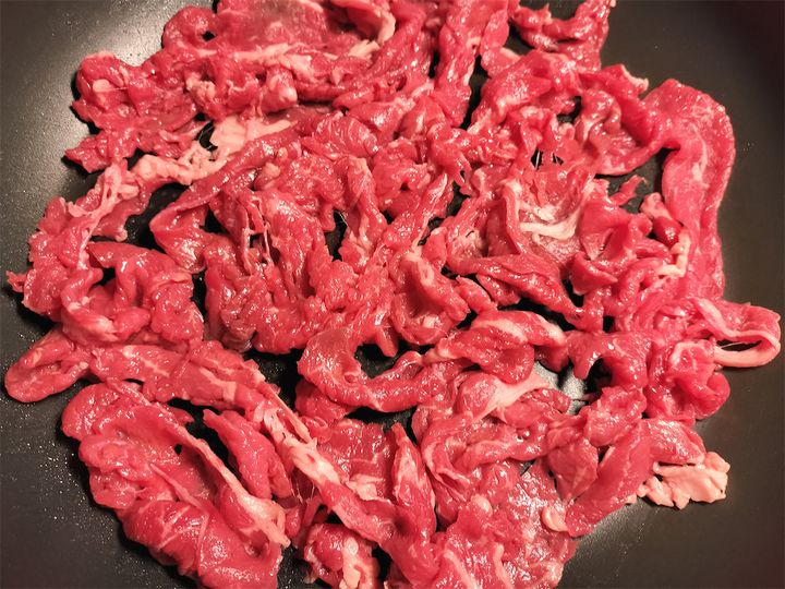3. フッ素樹脂加工のフライパンに油をひかずに牛肉の半量を広げて入れ、強めの中火にかけます。
