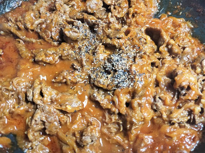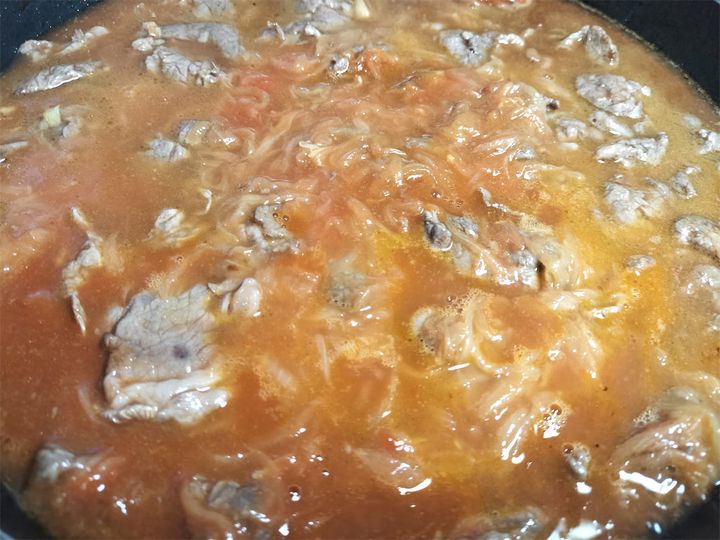9. 牛肉がかぶるくらいまで水(分量外)を注ぎ、時々混ぜながら牛肉がやわらかくなるまで煮詰めます。食べてみてかたければ再び水(分量外)を加え、煮込みます。