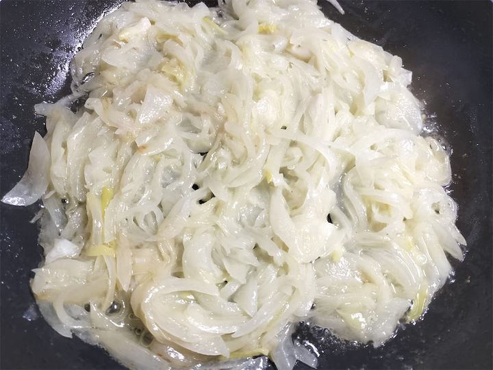 6. 水分が飛んで玉ねぎの縁が色づいたら動かしながら炒め、再び水(分量外)をヒタヒタに注いで煮詰めます。