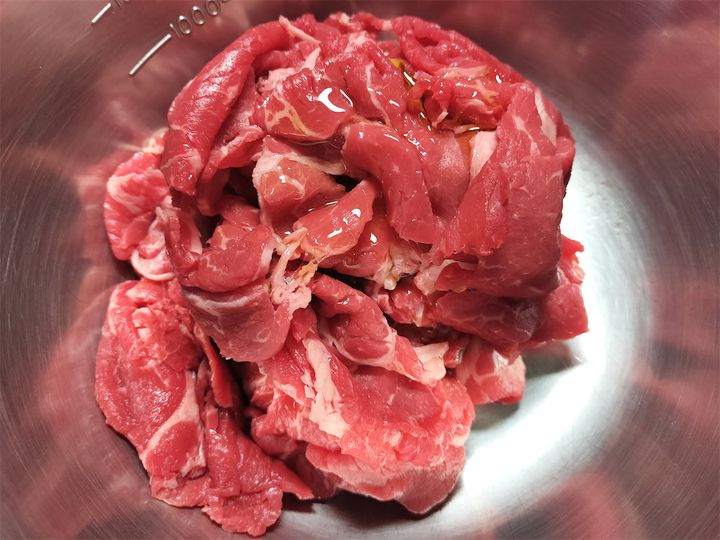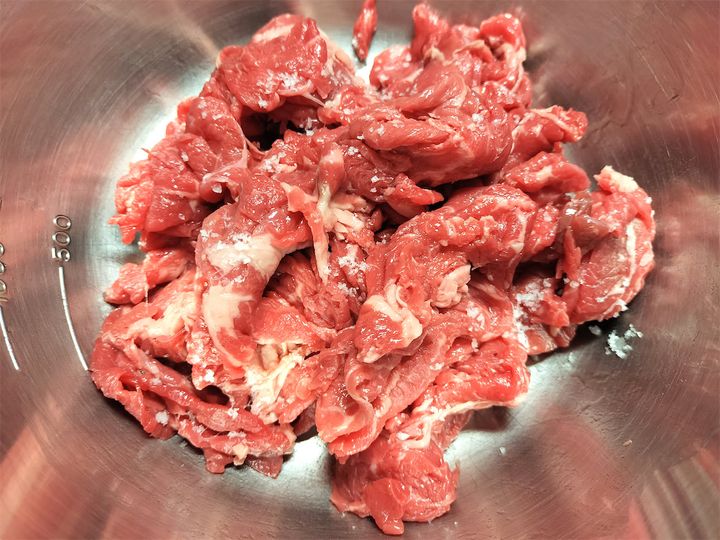1. ボウルに牛肉とオリーブオイルを入れ、手で肉をほぐしながら油をまとわせます。