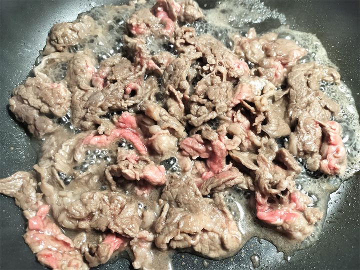 4. 焼き色がついたら全体をさっと炒め、ボウルに取り出します。残りの牛肉も3~4の手順で炒めてボウルに取り出します。