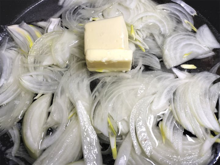 5. 同じフライパンに水(分量外)を約1cmの深さまで注ぎ、玉ねぎとバターを加えて強めの中火で煮ます。