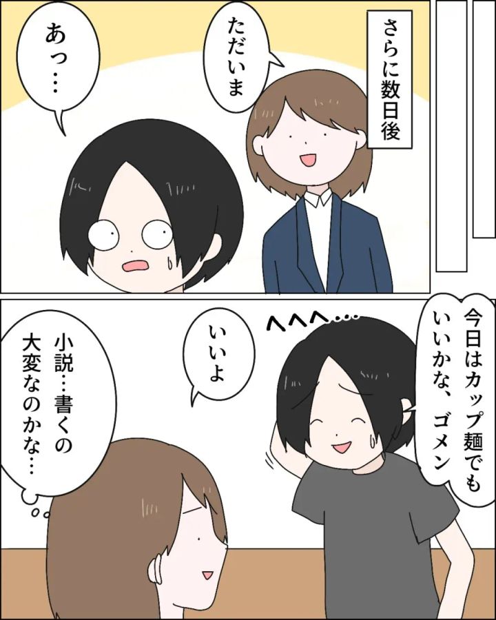 「ただいま」そう声をかけると、「あっ・・今日はカップ麺でもいいかな、ゴメン」そう言われ、「いいよ」と答えたものの、小説・・書くの大変なのかな・・と心配になりました。