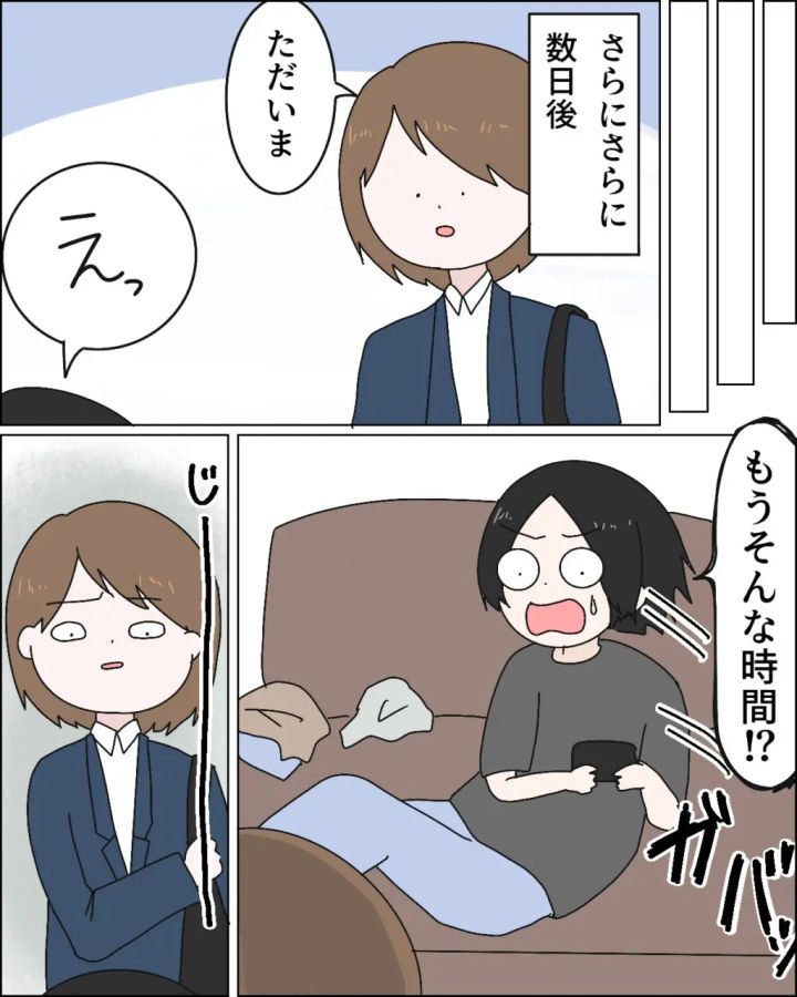 「ただいま」と言うと、「えっ!もうそんな時間!?」と慌ててソファから体を起こすフミヤ。その姿をジーっと見ると、