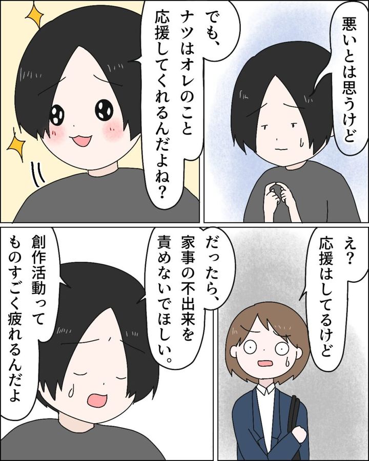 すると、「悪いとは思うけど、でも、ナツは俺のこと応援してくれるんだよね?」ときゅるんとした目で言うフミヤ。「え?応援はしてるけど」と答えると、「だったら、家事の不出来を責めないでほしい。創作活動ってものすごく疲れるんだよ」と言い訳を始めました。