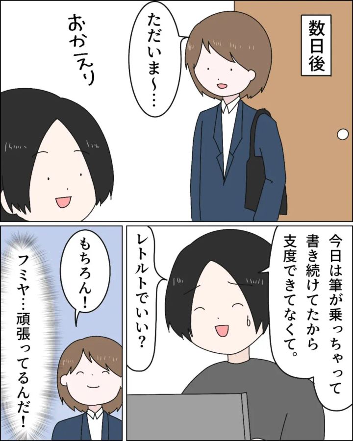 売れっ子小説家になる!と自信満々で、私に何の相談もなく会社を辞めてしまったフミヤ。半年間の期限付きでフミヤの夢の応援をすると覚悟を決め、ルールを作りました。家事はフミヤがメイン、小説は毎日継続して書くこと。半年経っても手応えが無ければ就職してもらうことが条件。翌日、会社で後輩カナちゃんにフミヤのことを話すと、「先輩、旦那さんに甘くないですか?」と言われ、ちょっと思い当たる節があるかも・・」と動揺。でも何とかがんばると心に決めた私。家に帰ると、フミヤがごちそうを作って待っていてくれて、「フミヤ・・」と感激!これならやっていける!と思っていた数日後のこと。