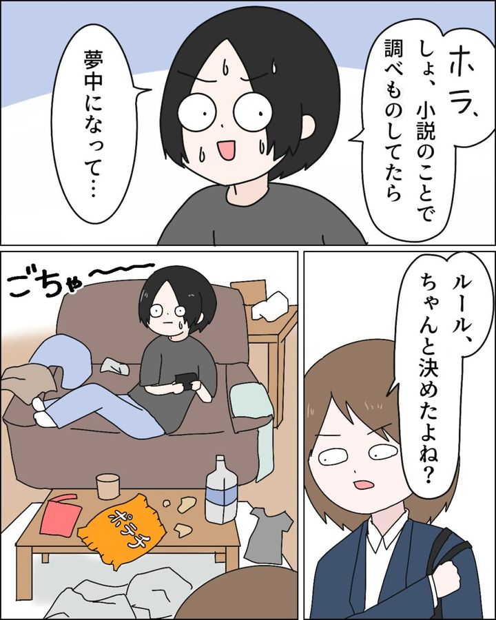 「ホラ、しょ、小説のことで調べものしてたら夢中になって・・」そう言いながら汗ダラダラのフミヤ。「ルール、ちゃんと決めたよね?」と詰め寄ると、テーブルの上には散らばったお菓子や飲み物、ごちゃごちゃの部屋でスマホを触っていたことがバレバレ。