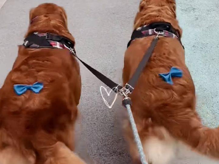 リボンをつけたら可愛さ倍増! 仲良しゴールデンのお散歩風景