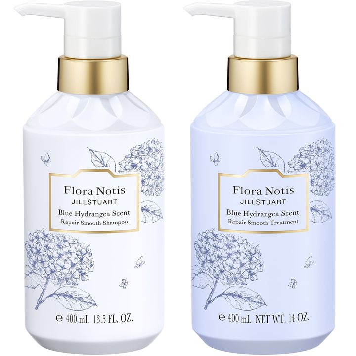 ブルーハイドレンジア リペアスムースシャンプー・リペアスムーストリートメント 各400ml 各¥3,300(フローラノーティス ジルスチュアート)