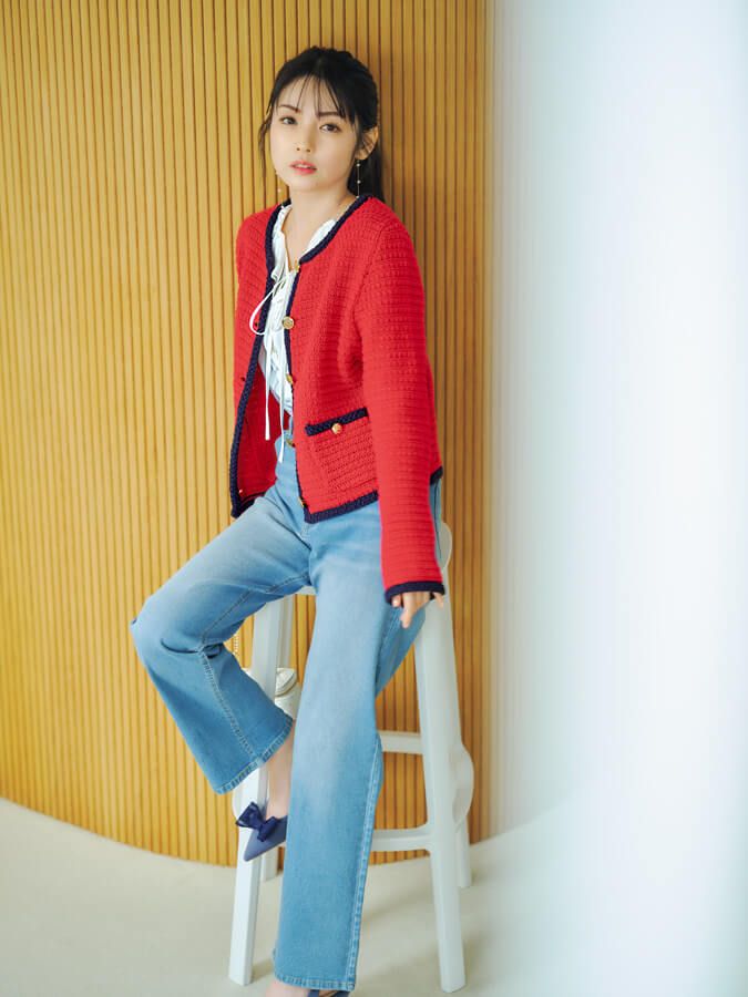 ドラマチックな赤カーデが映えるのは、黒髪さんだからこそ! ボトムは淡いブルーデニムを選んで、トゥーマッチになりすぎるのを回避。
