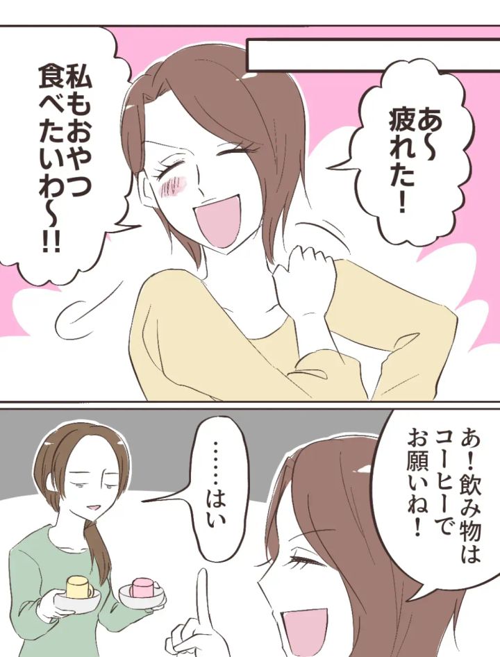 そして、「あ~疲れた!私もおやつ食べたいわ~!!」と肩を揉みながら部屋に戻って来たチエさん。「あ!飲み物はコーヒーでお願いね!」と注文され、「・・はい」と呆れながら静かに返事をしました。