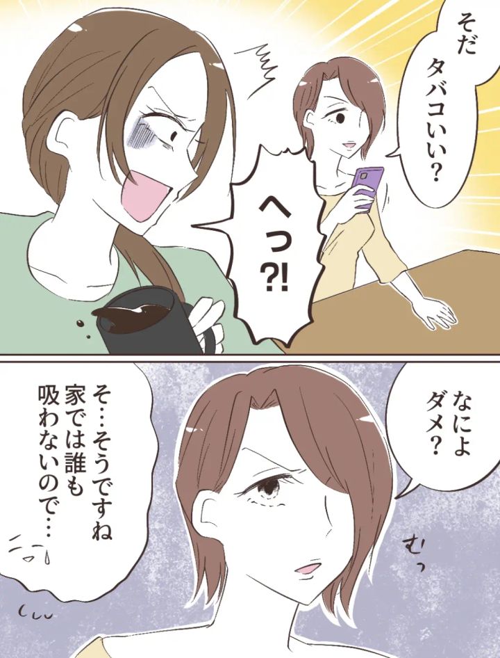 「お母さん、タバコ嫌いだから知られると面倒でさ。だから家では吸ってないの」チエさんの言葉に、「・・うちで吸うのはいいの?」と疑問が・・。「で、吸ってもいい?」平然と言うチエさんに、「何が『で』?」と心の中で呟く私。