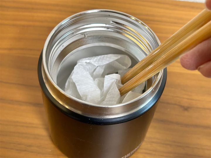 5.1で予熱しておいたスープジャーのお湯を捨てて、キッチンペーパーで軽く水気を拭き取ります。