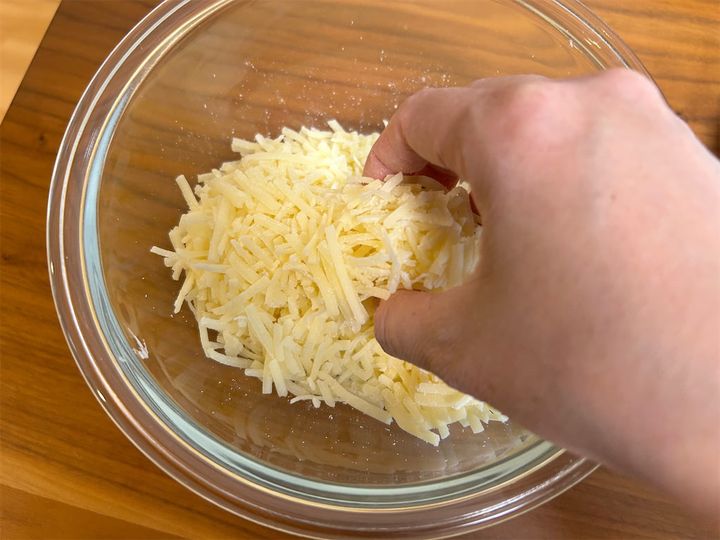 ピザ用チーズに片栗粉を加えます。片栗粉でとろみをつけることで、温かさをよりキープしやすくなるとのことです。