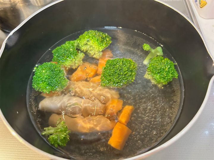 ブロッコリーとにんじんは柔らかくなるまでに少し時間がかかるので、茹で時間は少し長めに6分ほど。