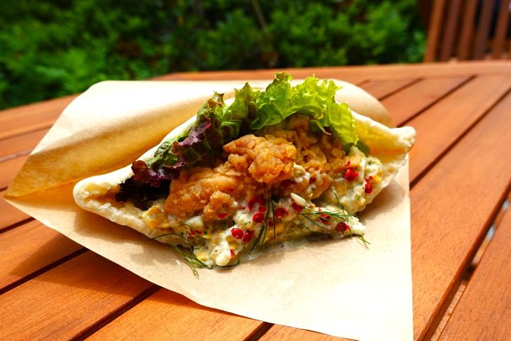 宮崎のソウルフード「チキン南蛮」をピタパンに挟んだインパクトのあるサンド。存在感のあるチキンはかなり分厚くカットされていて食べ応え満点! タルタルには宮崎産のゆずを使った柚子胡椒が使われており、ピリッと大人の味でお肉との相性は言わずもがな抜群。野菜もたっぷりと入っていて満足度も申し分なし! これ一つで650円、コスパよすぎです。