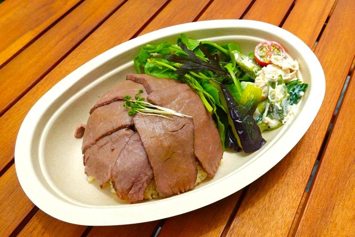 宮崎を代表するブランド牛「宮崎牛」のローストビーフがたっぷりとのった一品。じっくりと時間をかけて低温調理したお肉は時間が経ってもしっとりとした食感で、テイクアウトにもピッタリです。付け合わせの「佐土原ナス」の揚げびたし、野菜のマリネもこだわりを感じる味わい◎