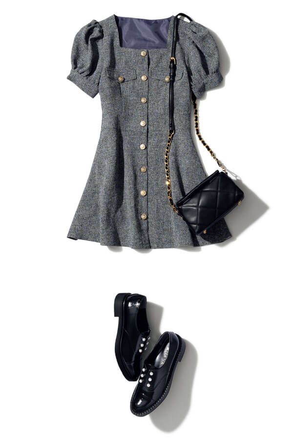 ツイードのシックな色みとリッチな金ボタンで、トレンドのミニ丈を大人の令嬢テイストに。足元はマニッシュな黒ローファーで、洒落感ある甘辛バランスを狙って。