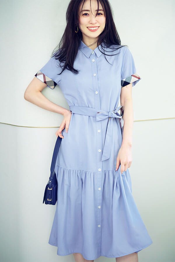 腰位置のフレアな切り替えでシャツワンピにレディなシルエットを加味。トレンドに左右されすぎない正統派デザインが強み。
