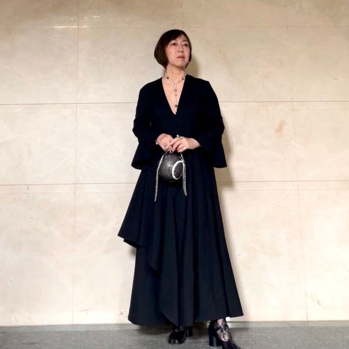 今回は、上林恵子さんが「ミラ ショーン バイ チカ キサダ」のブラックワンピースで魅せる、フォーマルな装いをご紹介します。