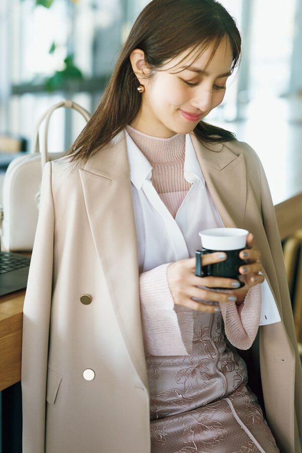 プレーンなシャツにシアーニットを忍ばせてオフィス服に差をつけて。ピンク×ベージュでまとめて、フェミニンでありながら洗練された雰囲気に。