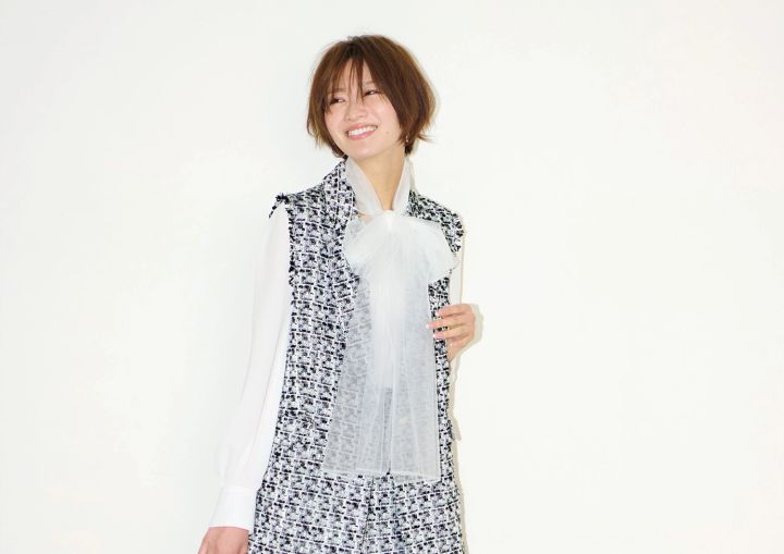 ツイードセットアップは、リボンブラウスで旬なインパクトを加えて、クラシックに傾きすぎないように着るの今っぽくなるコツ。全体をモノトーンでそろえることで、大胆な甘さも上品にまとまる。