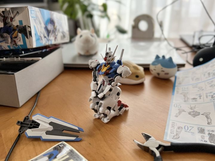 完成まであとまもなく…!という楽しみを目前にして席を立った息子さん。ガンプラも、お利口に待っているように見えて、なんだかとてもかわいいですよね。早く完成させてーと言っているのでしょうか。さまざまなかっこいいポーズをすることができそうですが、これを見たら、こういうポーズの方が似合うのではないかと思ってしまいます(笑)