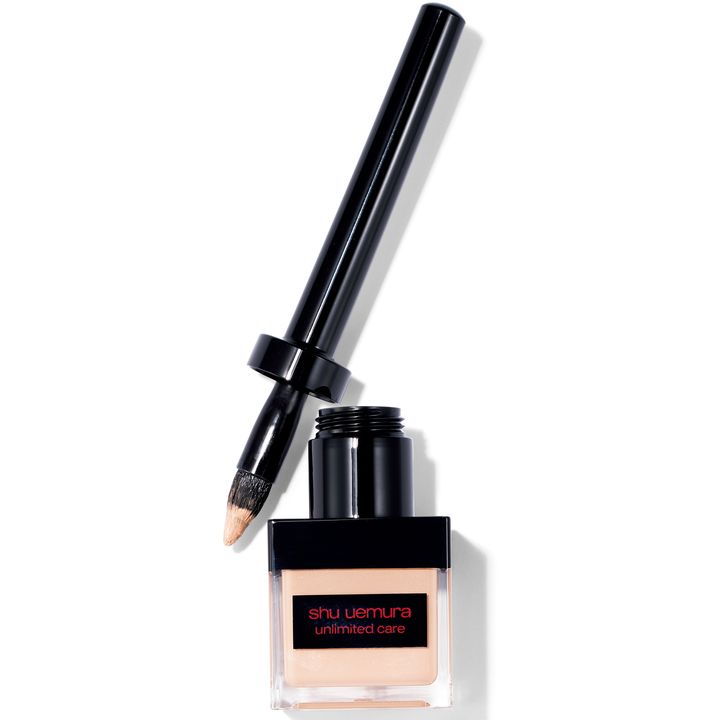 ブラシ形状のコンシーラーが、瑞々しく肌と同化。広く塗っても目立ちにくい。アンリミテッド ケア フェイス カリグラフィー 全8色 各13g ¥7,260(シュウ ウエムラ)