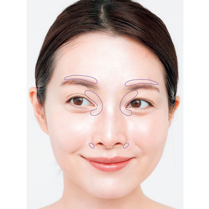 眉頭下から目頭下の“くの字”ゾーンの肌色を整えると眉間の幅が広く見え、その対比で鼻が小さい印象に。また、眉上を整えると鼻以外のパーツの位置が下がって見え、さらにスッキリ。小鼻の凹みだけでなく、頰や額のくすみ、シミなどのアラももれなく隠せて、鼻筋もスーッと通ります。コンシーラーは自分の肌よりワントーン明るい肌色を選んで、ピンク系は避けて。