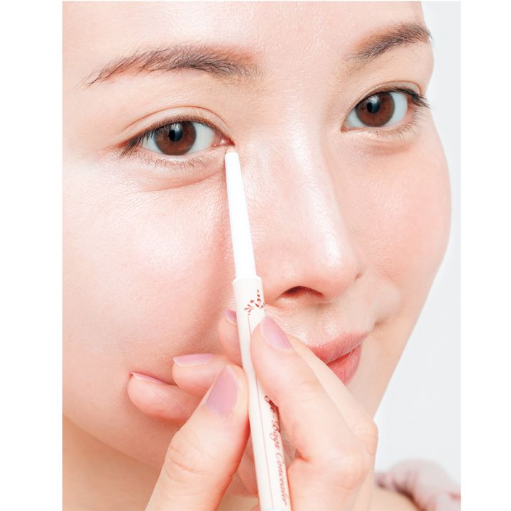 〈モデル使用〉特に動きが激しい目まわりには、ペンタイプがヨレにくくて安心。3mmの細芯で扱いやすく、肌馴染みも◎。キャンメイク アイバッグコンシーラー 01 ¥715(井田ラボラトリーズ)