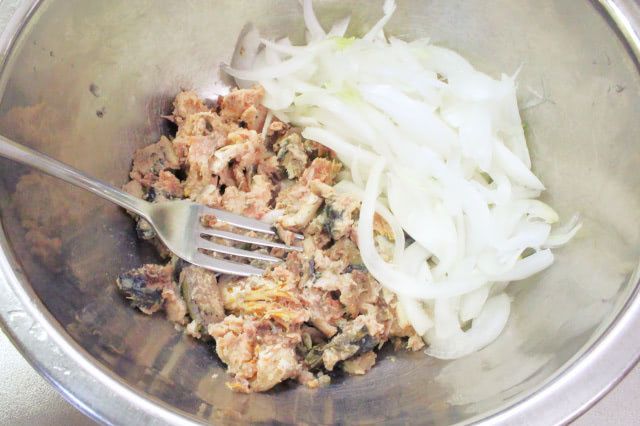 缶詰のサバなので、簡単にほぐれます。少し形が残るくらいにほぐしました。