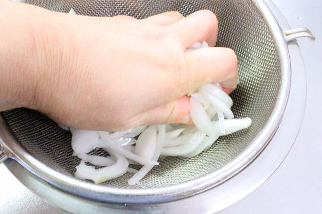 1. 玉ねぎを薄切りにし、水(分量外)に10分ほど晒してから、水気をしっかりと切ります。
