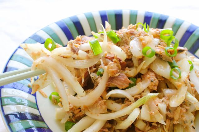 食べてみると、新玉ねぎがシャキシャキとしていて、ほんのりと甘味があります。サバの水煮の旨味が広がる〜♪