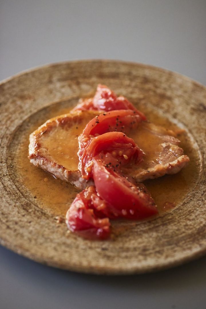 漬け汁をきったトマトの昆布水漬け、バターを入れて中火にかけ、混ぜながら温める。焼いた豚肉にかけて粗びき黒こしょうをふればできあがり。