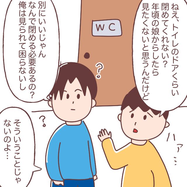 「トイレのドアくらい閉めてくれない?年頃の娘からしたら見たくないと思うんだけど」と夫に伝えると、夫は「別にいいじゃん。なんで閉める必要あるの?俺は見られて困らないし」と娘の気持ちを汲もうともせず反省ゼロ。「そういうことじゃないのよ・・」と話しの伝わらない夫に溜息が出ます。