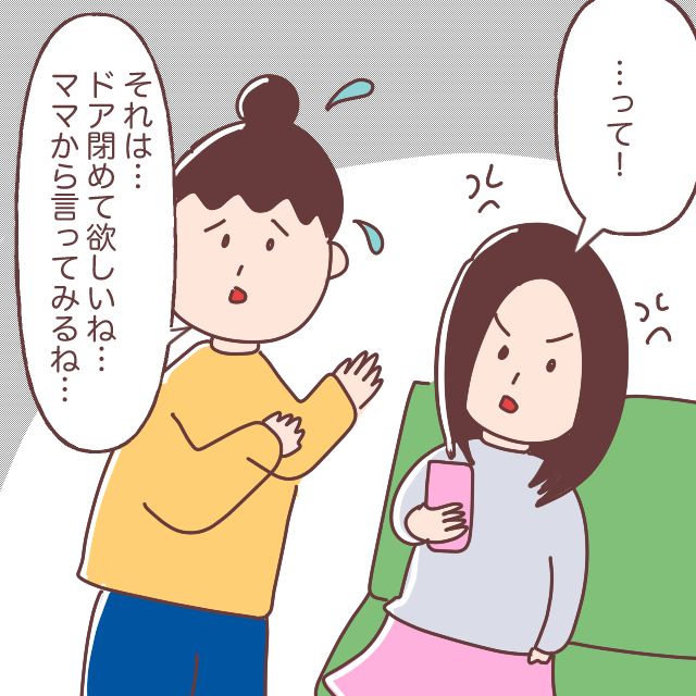 私に説明してくれた娘は、先ほどの夫の言動を思い出してイライラを募らせます。娘の話を聞き「それは・・ドア閉めて欲しいね・・」と同情した私は「ママから言ってみるね」と伝え娘をなだめました。
