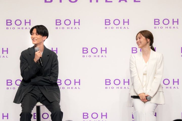 バイオヒールボは韓国オリーブヤングのプライベートブランドで、白石さんは「大人気のバイオヒールボのアンバサダーに就任させていただき、光栄です。日本でももっと魅力が伝わるように頑張りたいです!」とコメントし、渡邊さんは「男性やいろいろな世代の方にも使っていただきたいです」と意気込みました。