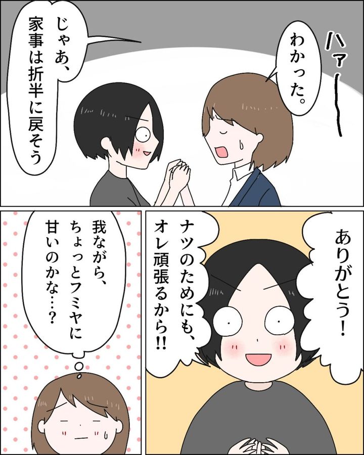 「ハァー、わかった。じゃあ、家事は折半に戻そう」と提案すると、「ありがとう!ナツのためにもオレ頑張るから!!」と満面の笑み。「我ながら、ちょっとフミヤに甘いのかな・・?」と反省しました。