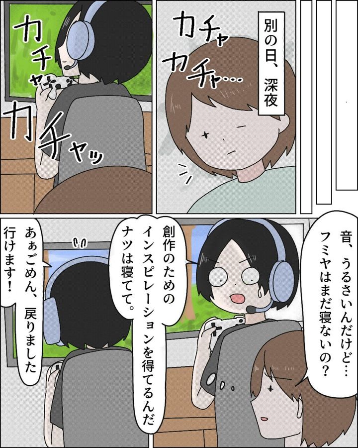 別の日の深夜には、カチャカチャ・・カチャカチャッと音が聞こえ起きてしまった私。「音、うるさいんだけど・・フミヤはまだ寝ないの?」と聞くと、「創作のためのインスピレーションを得てるんだ。ナツは寝てて」そう言った後、「あぁごめん!戻りました。行けます!」と画面越しの誰かに声をかけていたのでした。