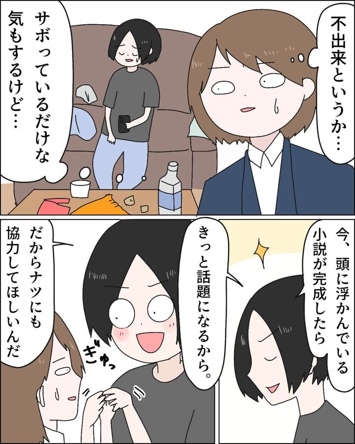 「家事の不出来は責めないでほしい」と言われ、「サボっているだけな気もするけど・・」と思いつつ、協力してほしいと言われたナツさんは、「家事を折半に戻そう」と提案。大喜びのフミヤさんは、その後、家事を全くしないどころか、どうやら小説も書いていないようですね。
