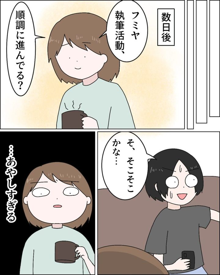 「フミヤ、執筆活動、順調に進んでる?」そう聞くと、「そ、そこそこかな・・」と動揺しながら答える様子に、「・・あやしすぎる」と勘づいた私。