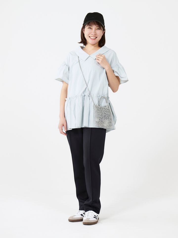 「パールやスパンコール、ビーズが付いたペルラ グリッターは華やかなので、どんなカジュアルスタイルもお出かけ仕様に格上げしてくれます。やんちゃな息子に踏まれても触られてもワイヤーバッグならそこまで気にならず使えて、バタバタとする運動会などの園行事にも重宝しています」Yuikaさん・35歳・会社員(157cm/3歳男の子ママ)